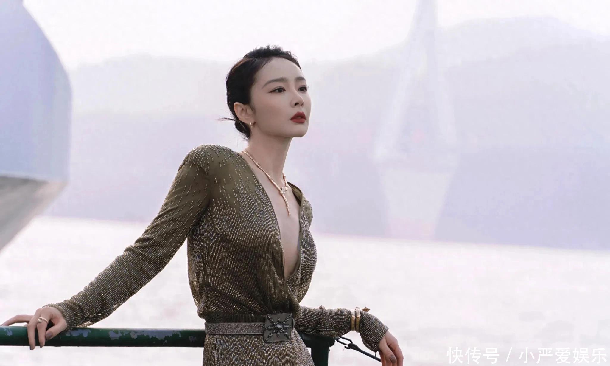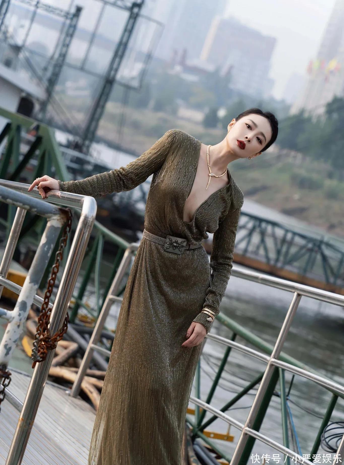 她选的那条橄榄绿长裙,真是温柔到了骨子里。深V的领口勾勒出肩颈柔和的曲线,裙身没有用张扬的亮片,反而是细腻的银线悄悄缀在薄纱上。
