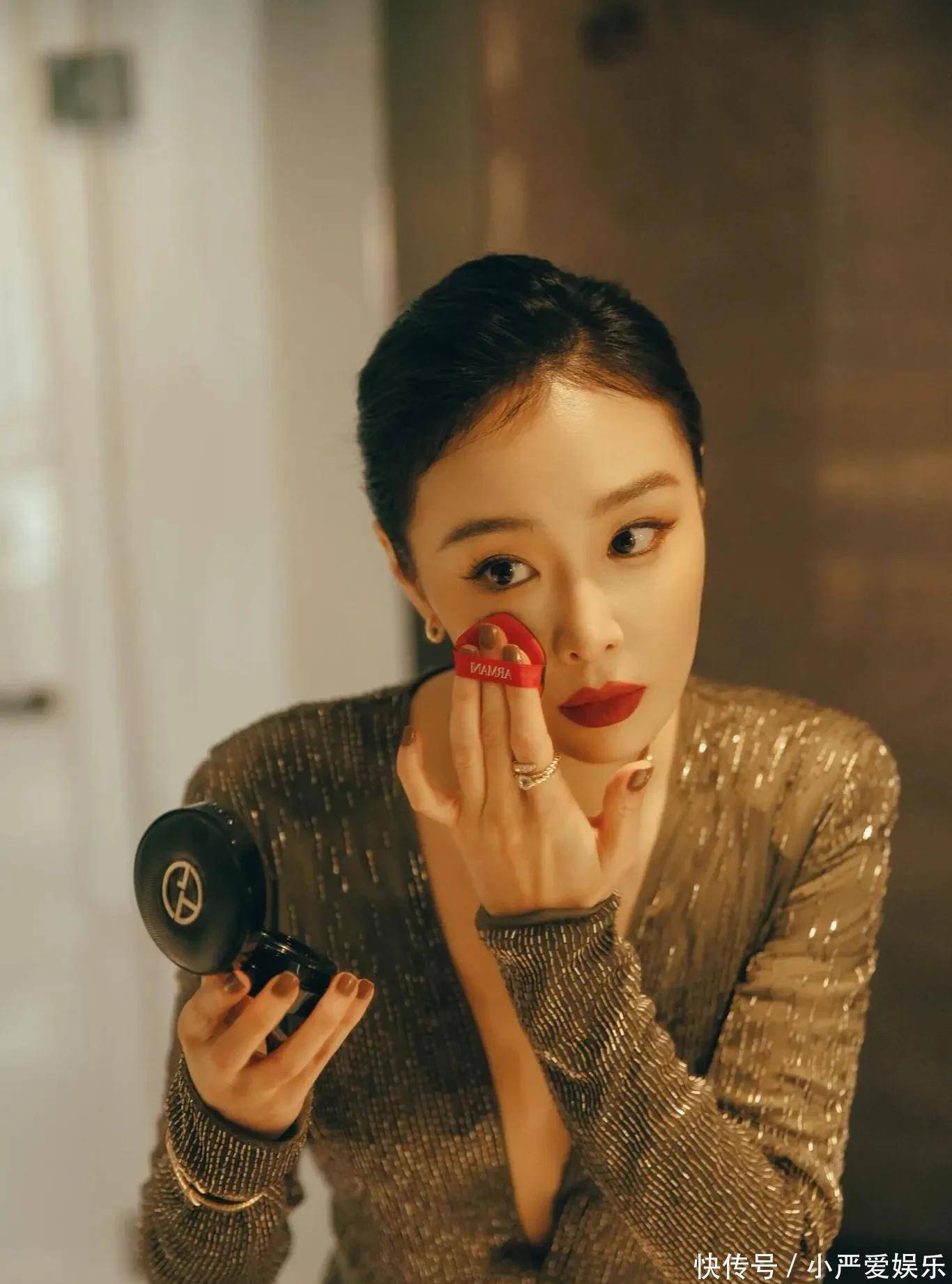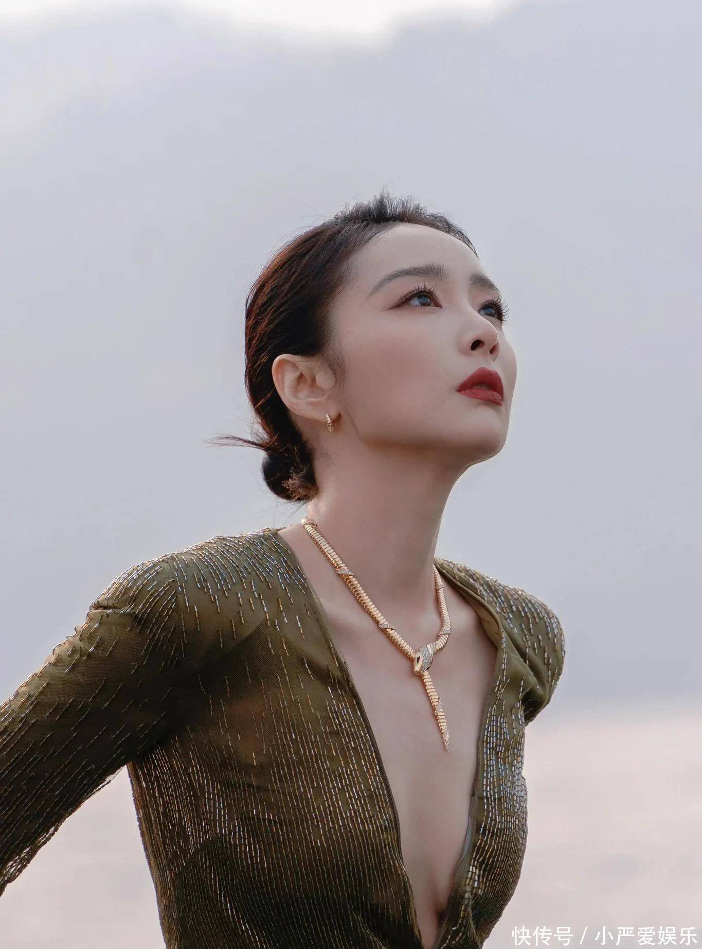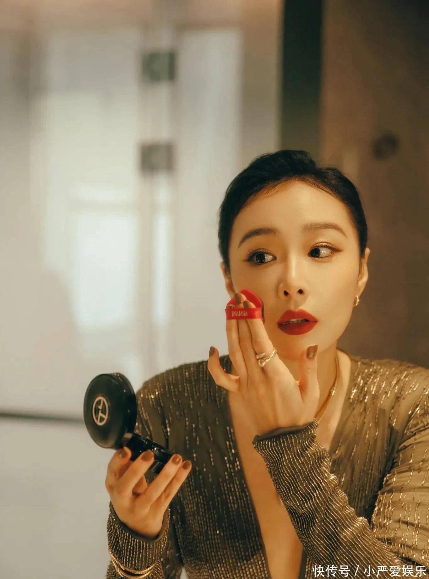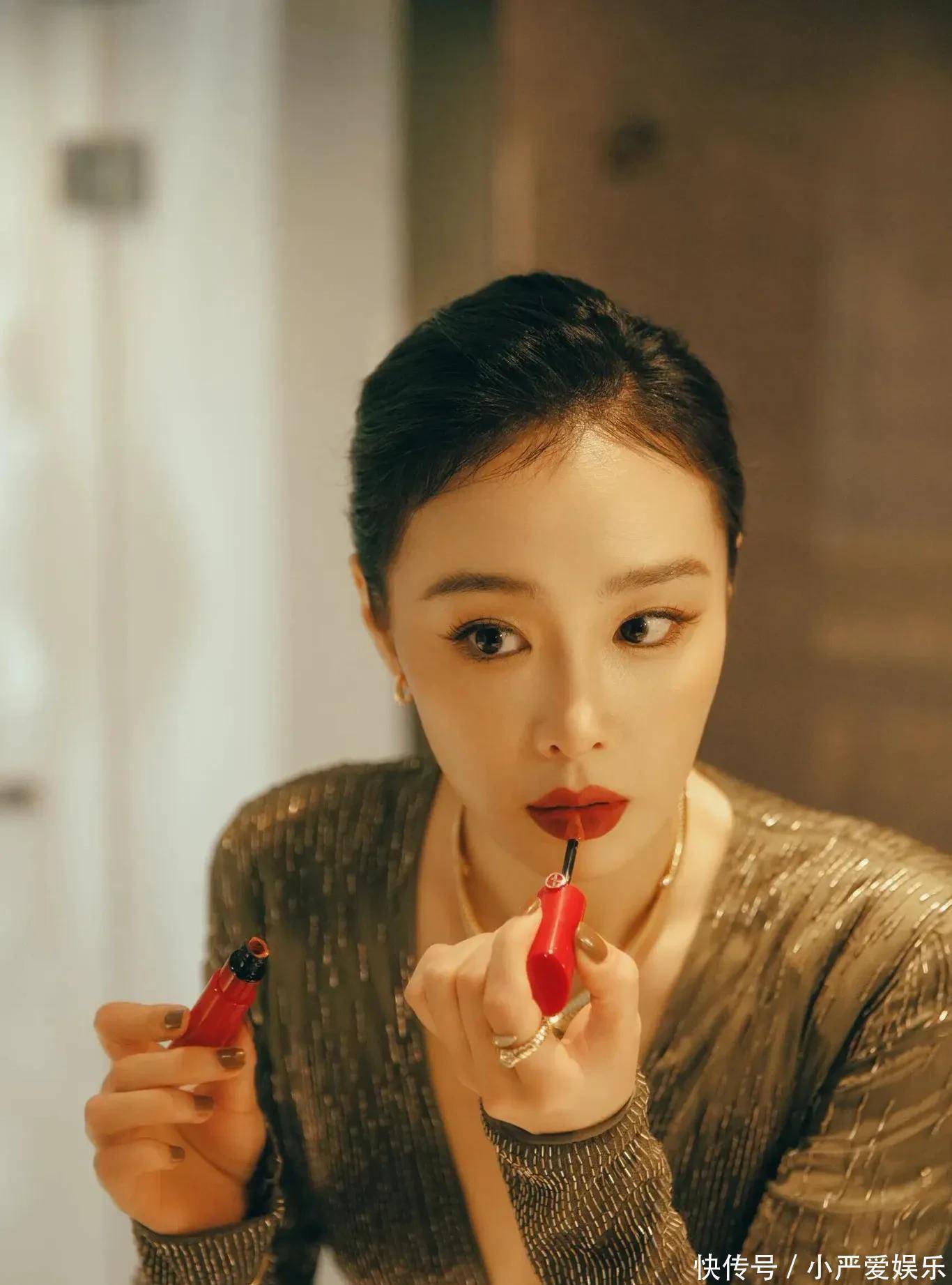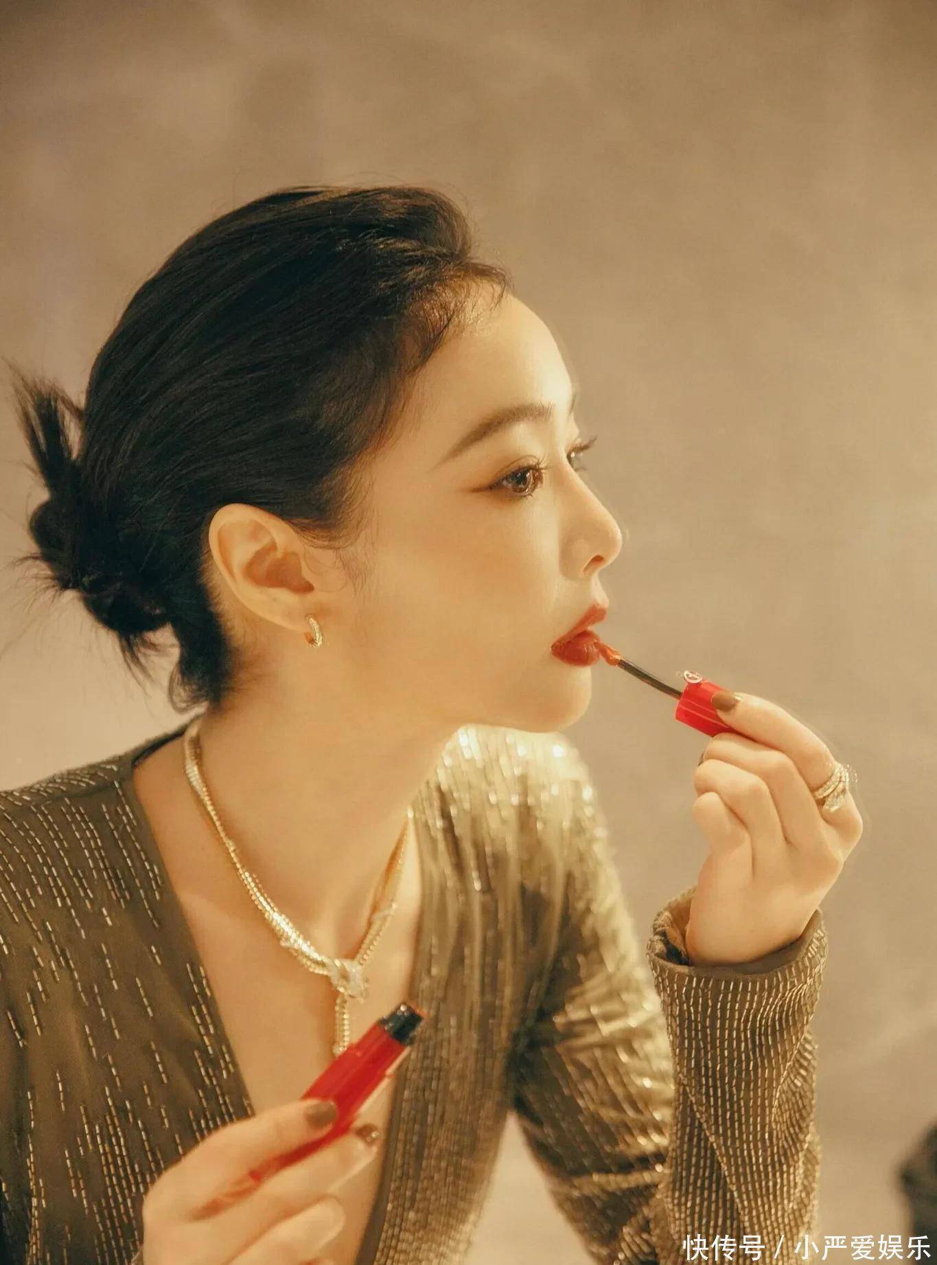 而那一抹红唇,是整身的点睛之笔。那不是鲜艳跳跃的红,而是沉静中带点棕调的复古红,像旧时光里走出来的色调。它与橄榄绿的裙摆静静相映,一冷一暖,交织出几分疏离,几分温柔。连补妆的细节都格外动人——红管唇釉,黑金气垫,叠戴的细链蛇骨项链,每一处都不争不抢,却自有分量。